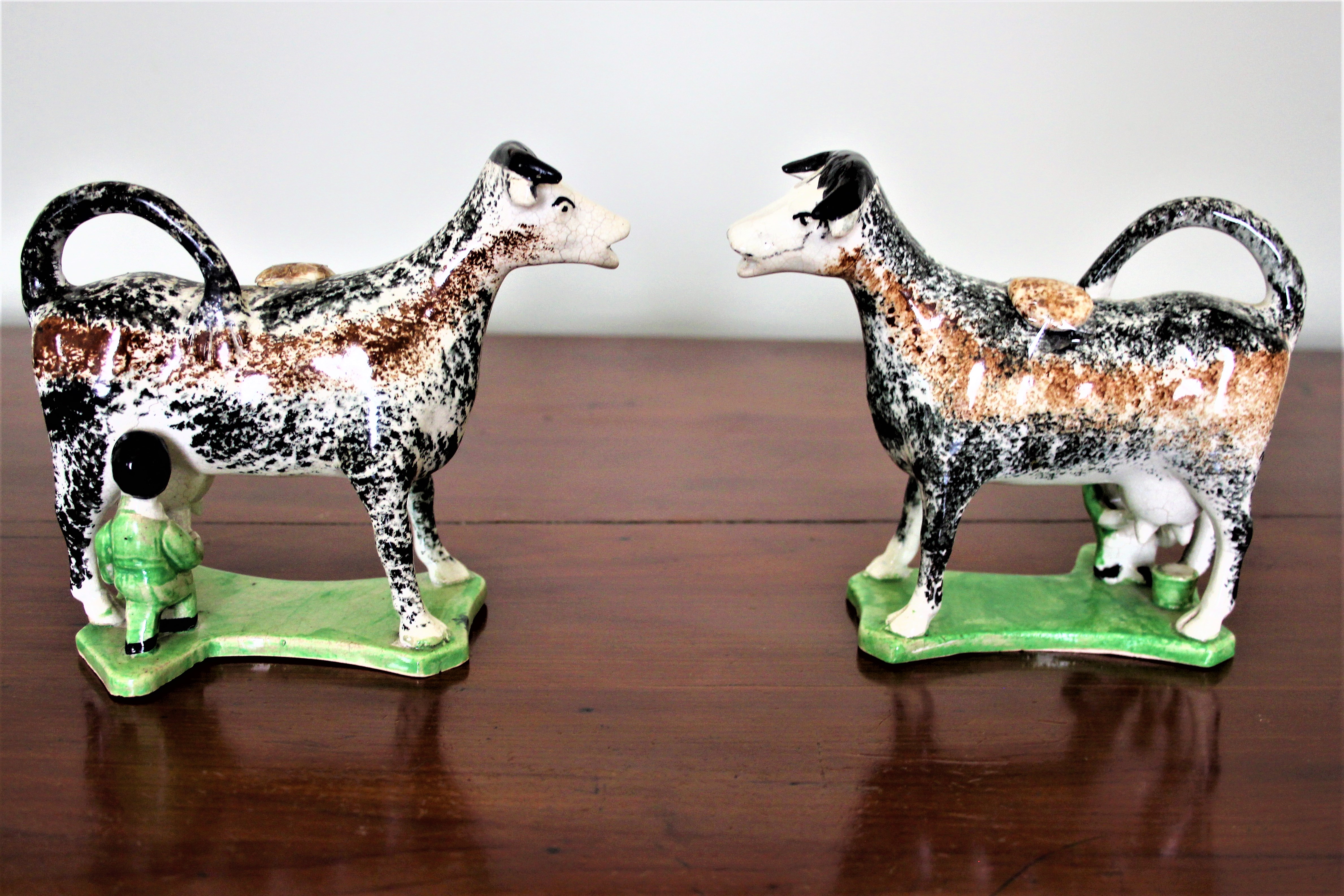 Pair Yorkshire Cow Creamers with milk maids.  Newcastle upon Tyne origin. Prattware mottled decoration, fine condition complete with lids.