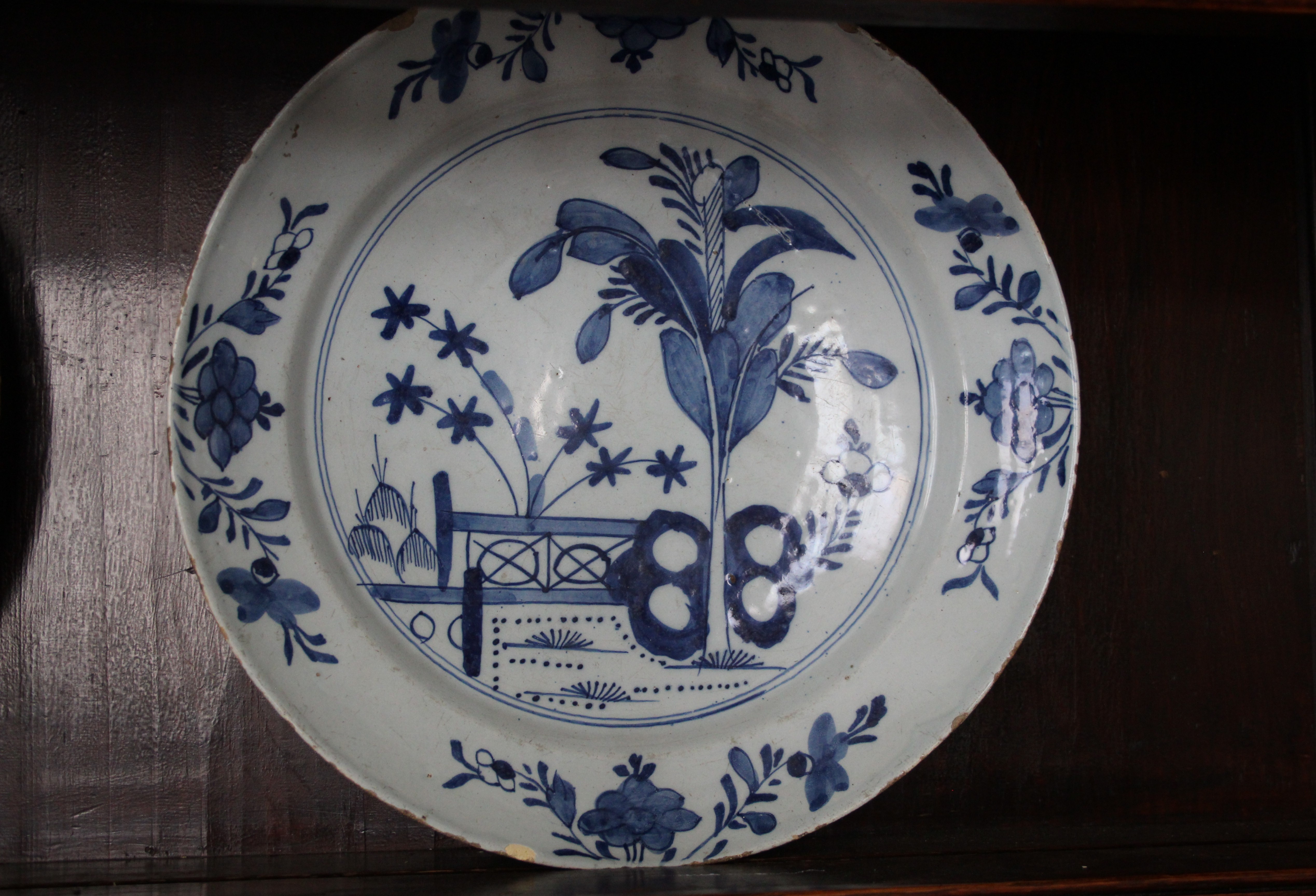 Bristol charger with a central design of a fence and large flowering plant, im decorated with further floral pattern.