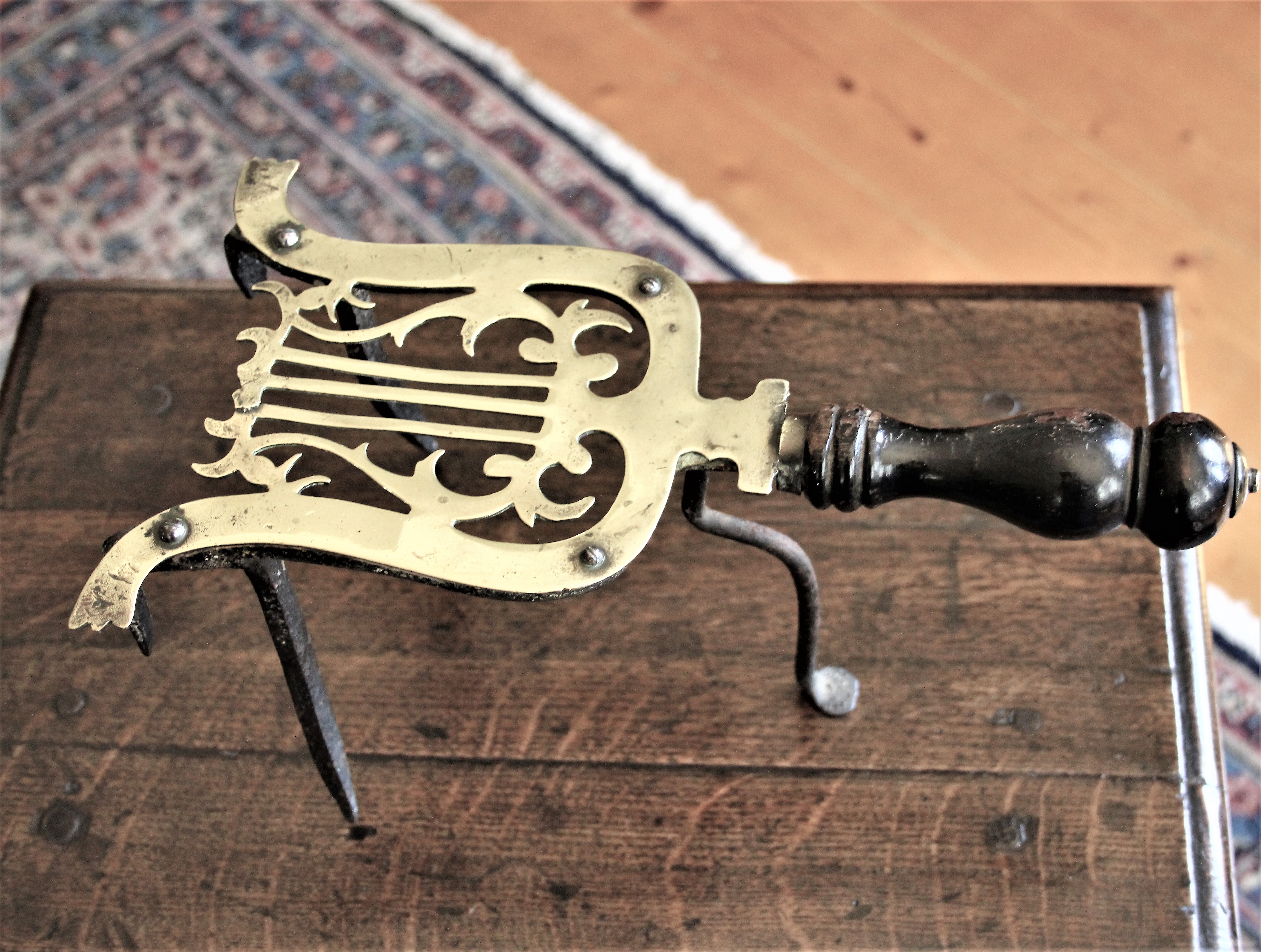 Georgian brass and iron trivet of lyre shape. Fruitwood handle.