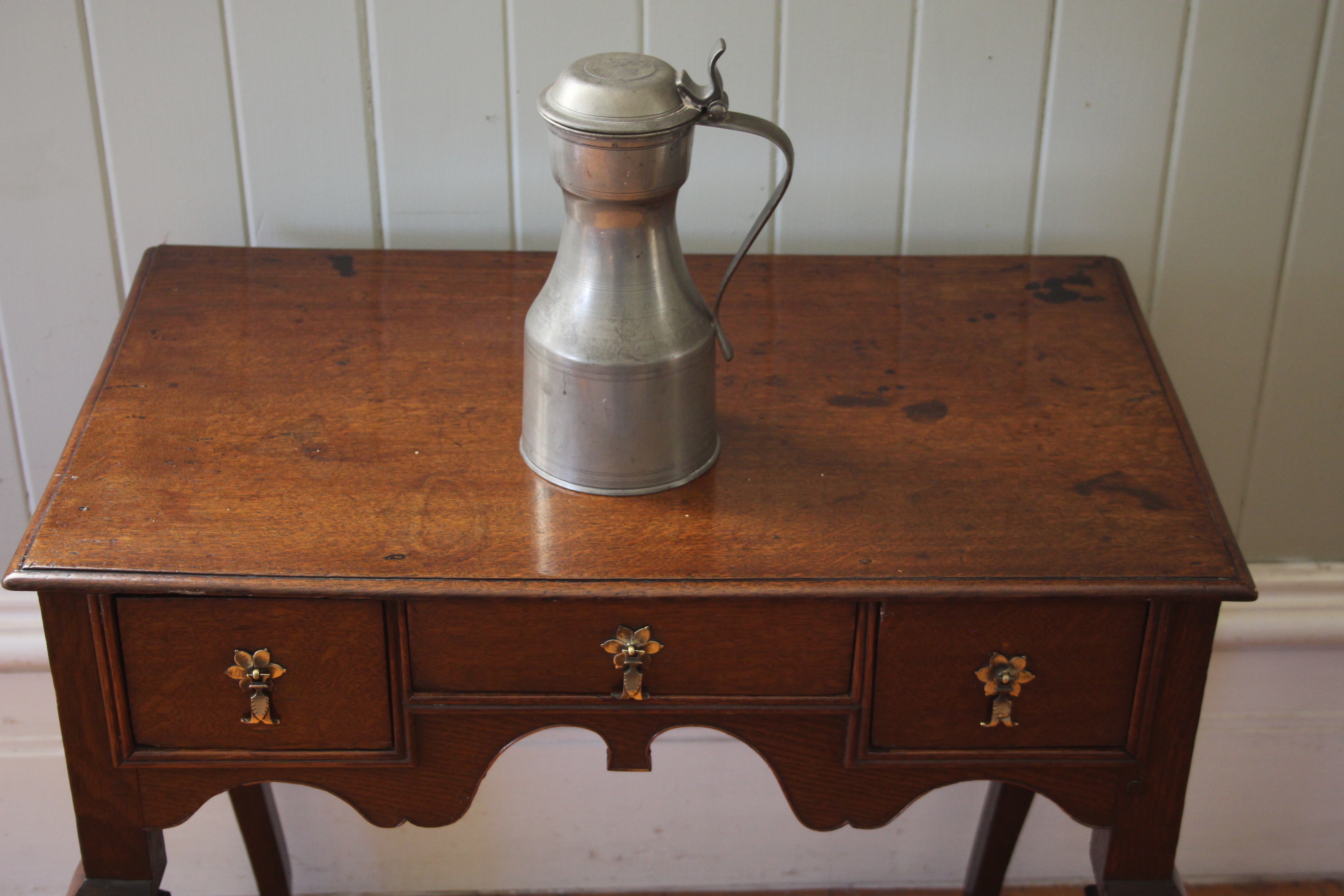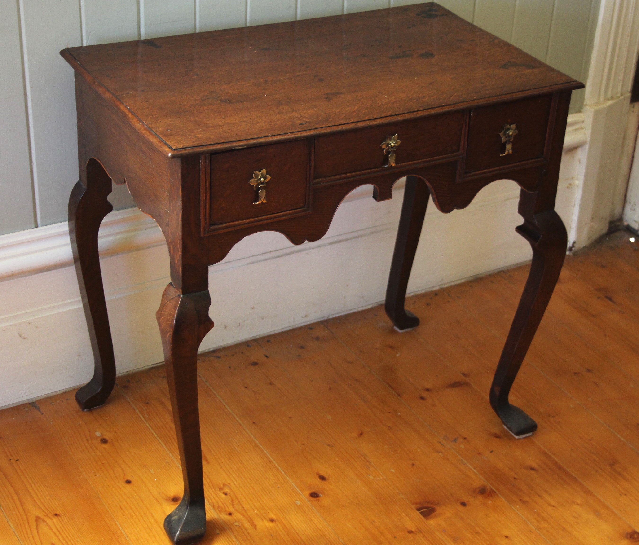 George I Oak Lowboy with three drawers original axe drop handles, double D moulding to each of the drawers and elaborately shaped apron.
