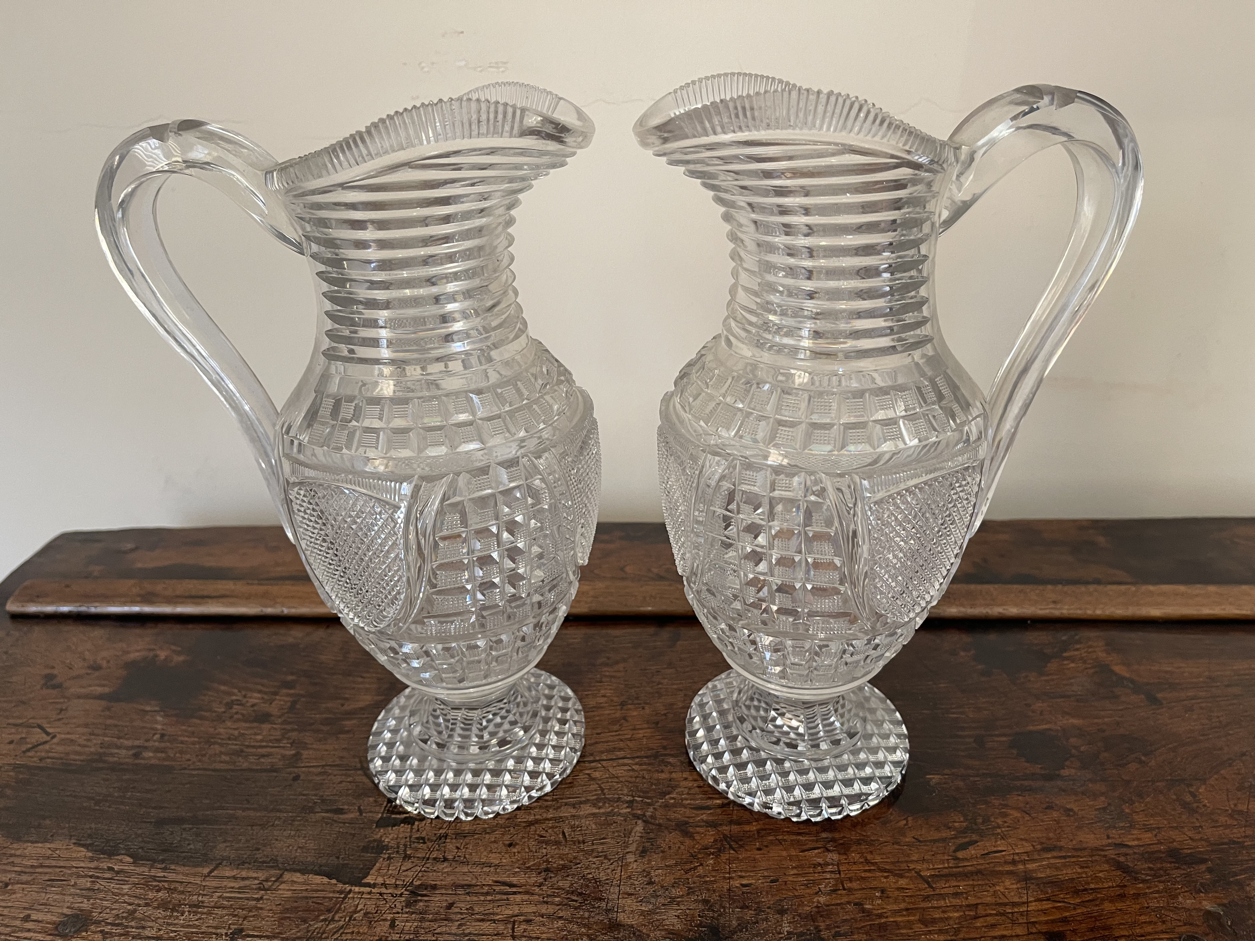Pair of early 19th Century Irish Claret jugs probably Dublin or Cork, extensive cutting of chequered diamonds, fine diamonds, prismatic cutting and with plain handles.