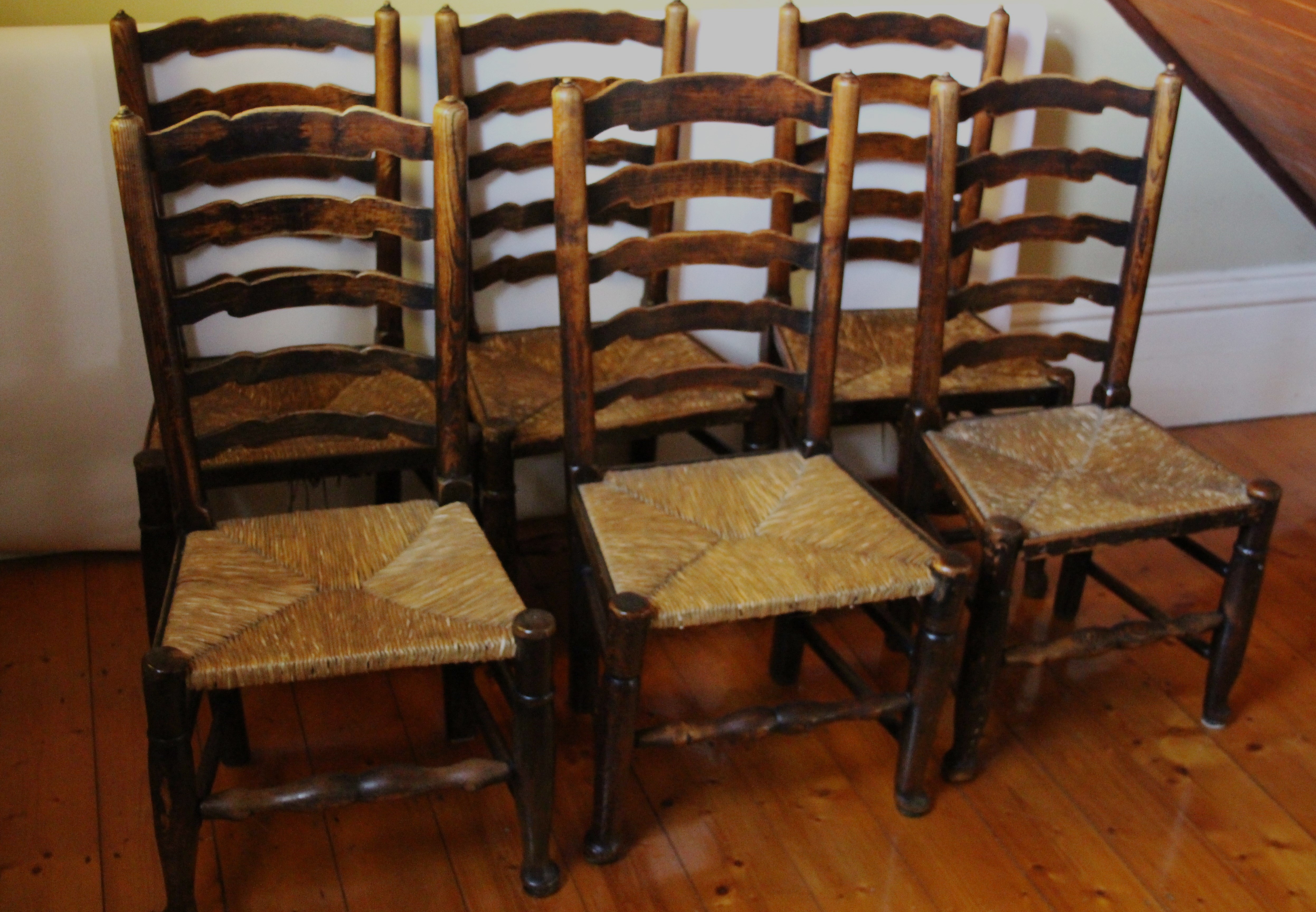 Lancashire Wavy Ladderback Chairs, set of six.  Genuine 18th Century ash and elm with rushed seats.