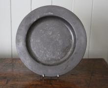 English Pewter plate with broad brim stamped with a crown and cross and London underneath.