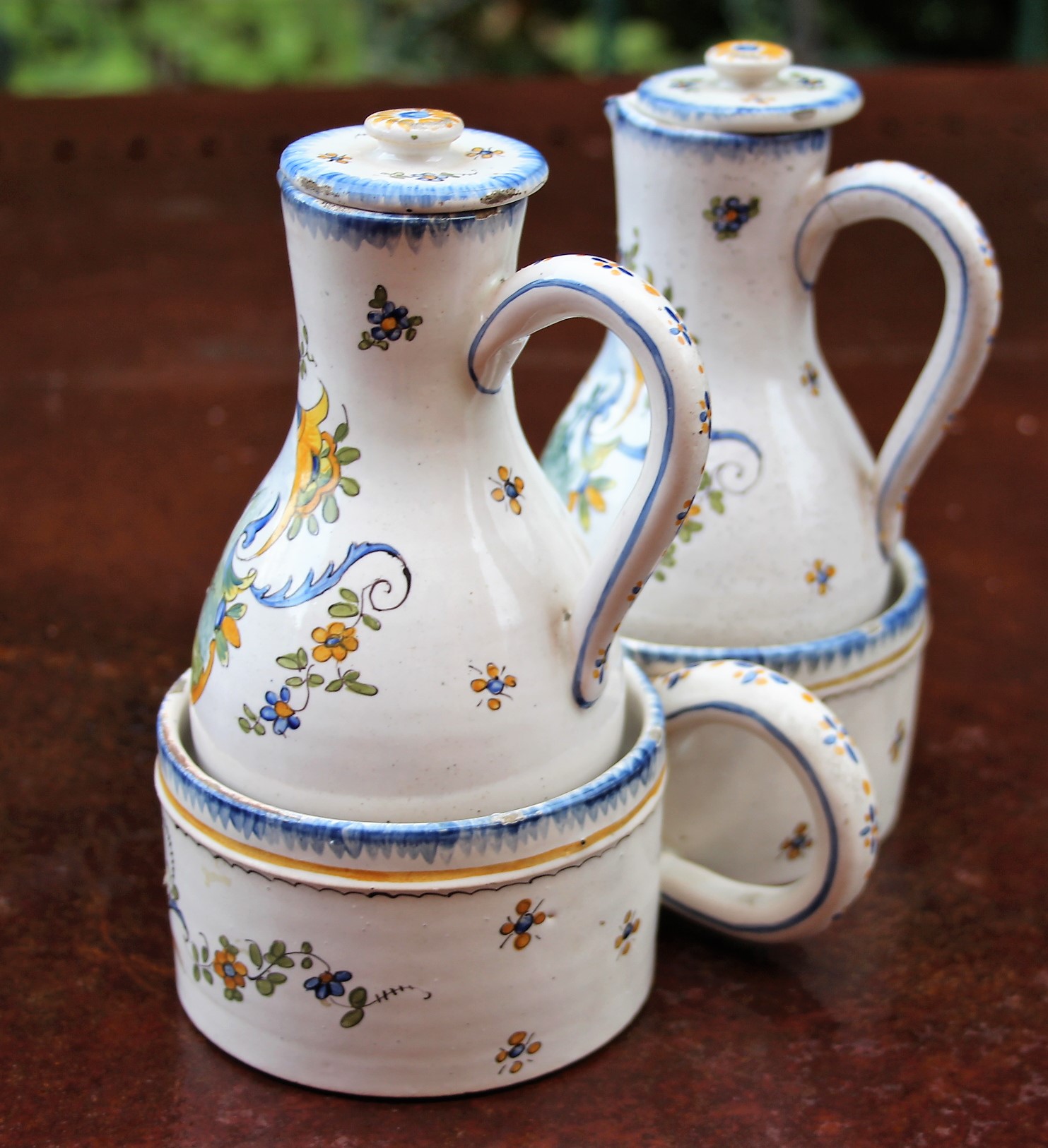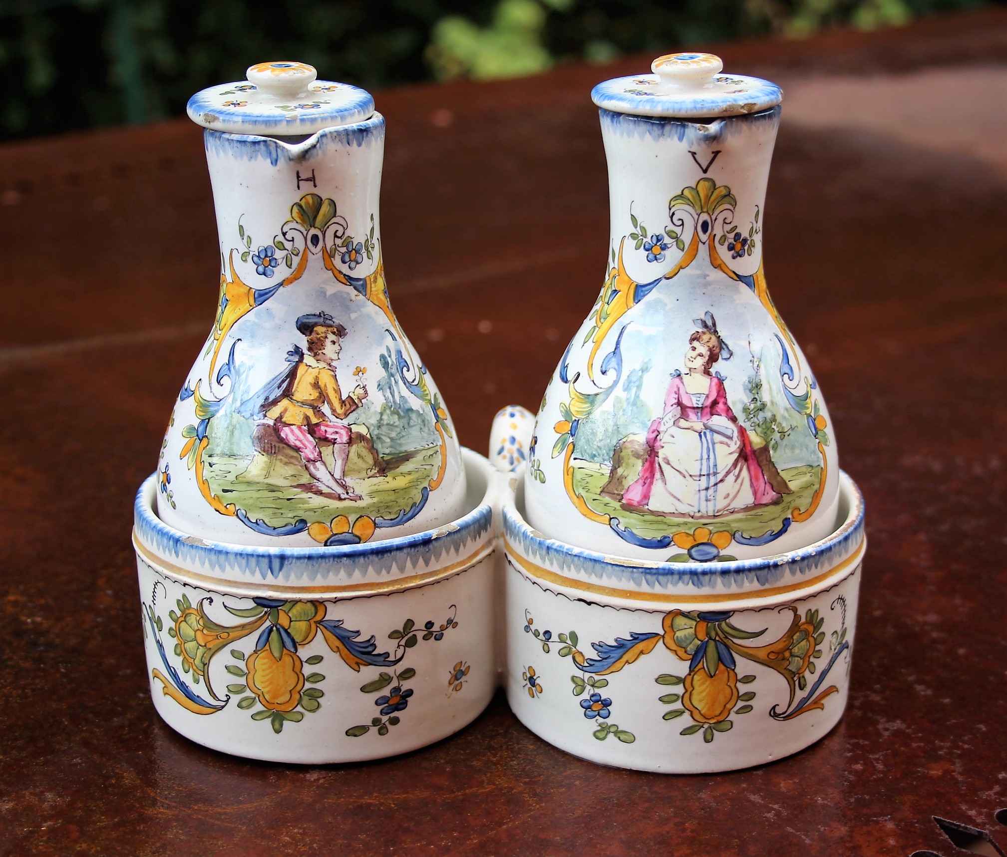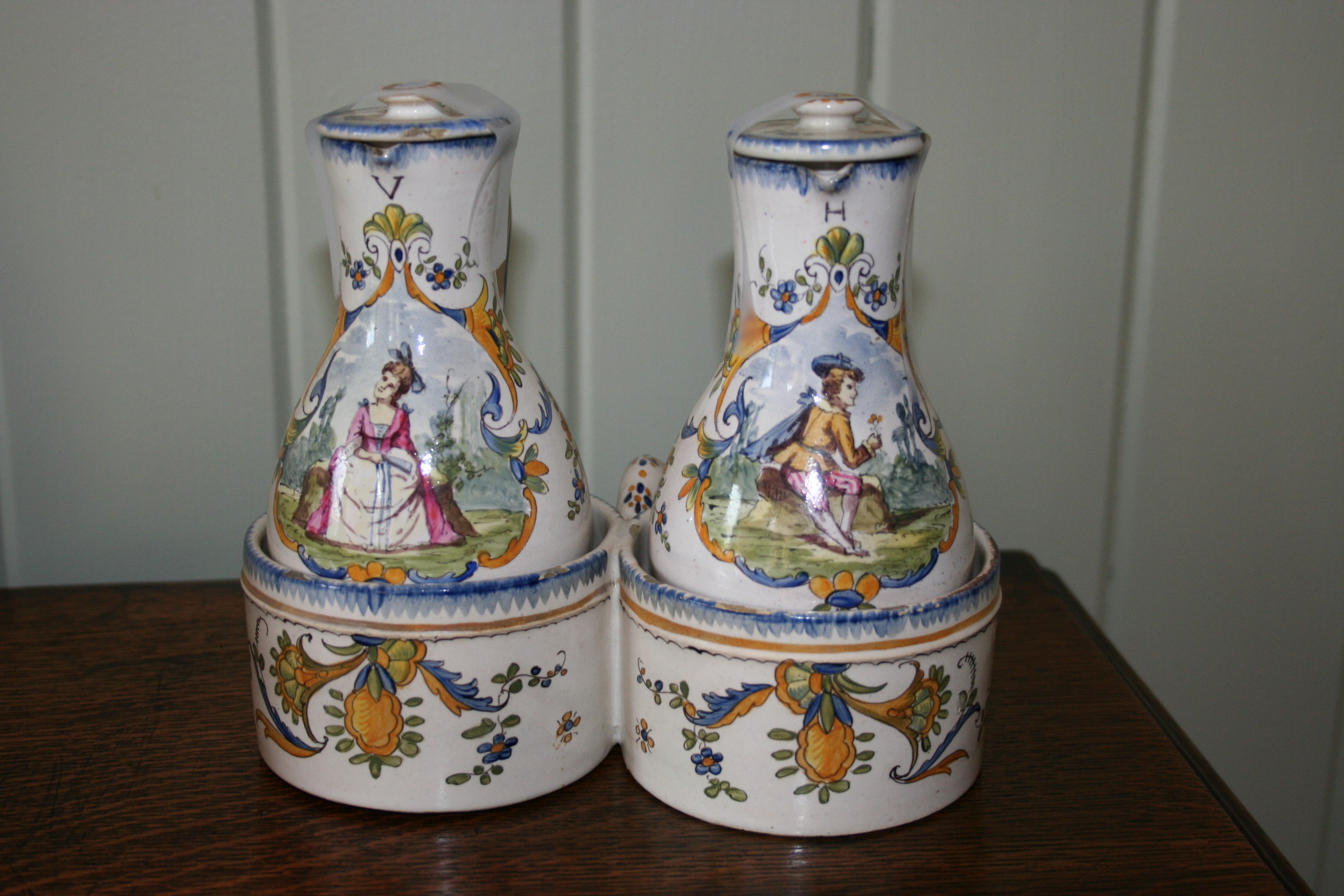 Rare French Faience Cruet Set from Rouen in fine original condition the bottles retaining lids. One botle marked "H" (huile) and the other "V" (vinaigre). Painted with figures in contemporary 18th Century dress.