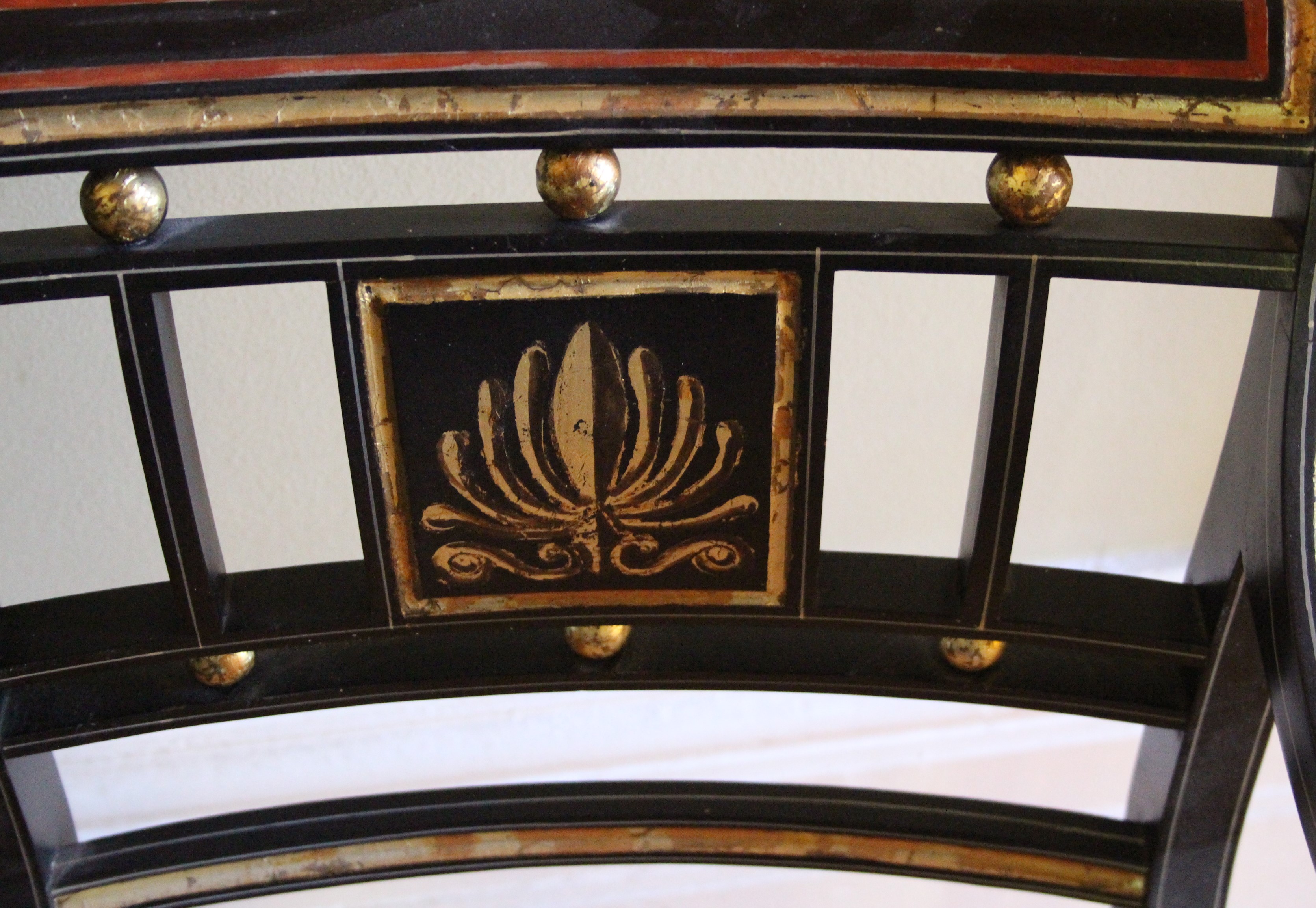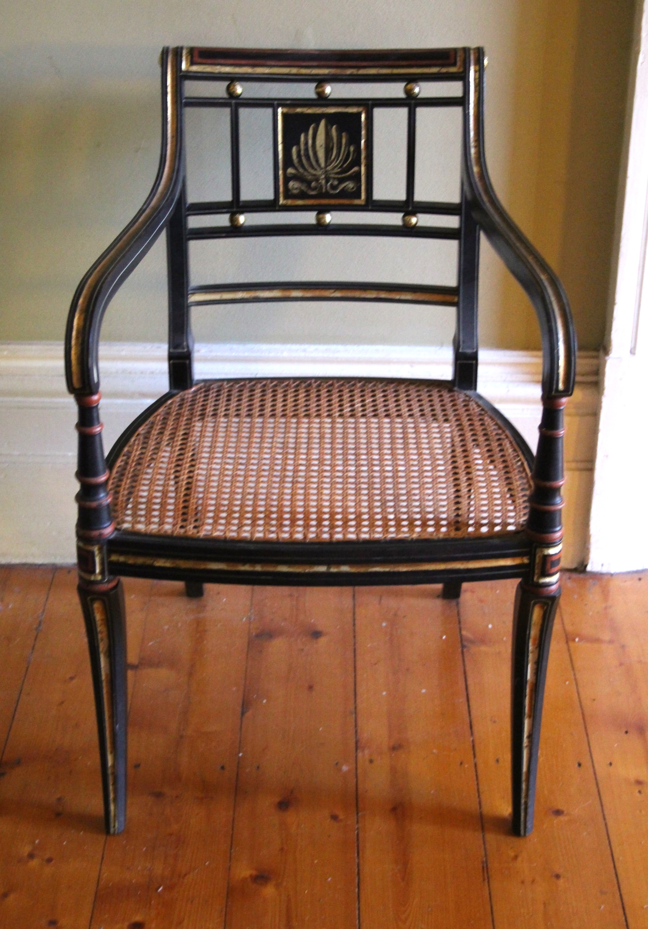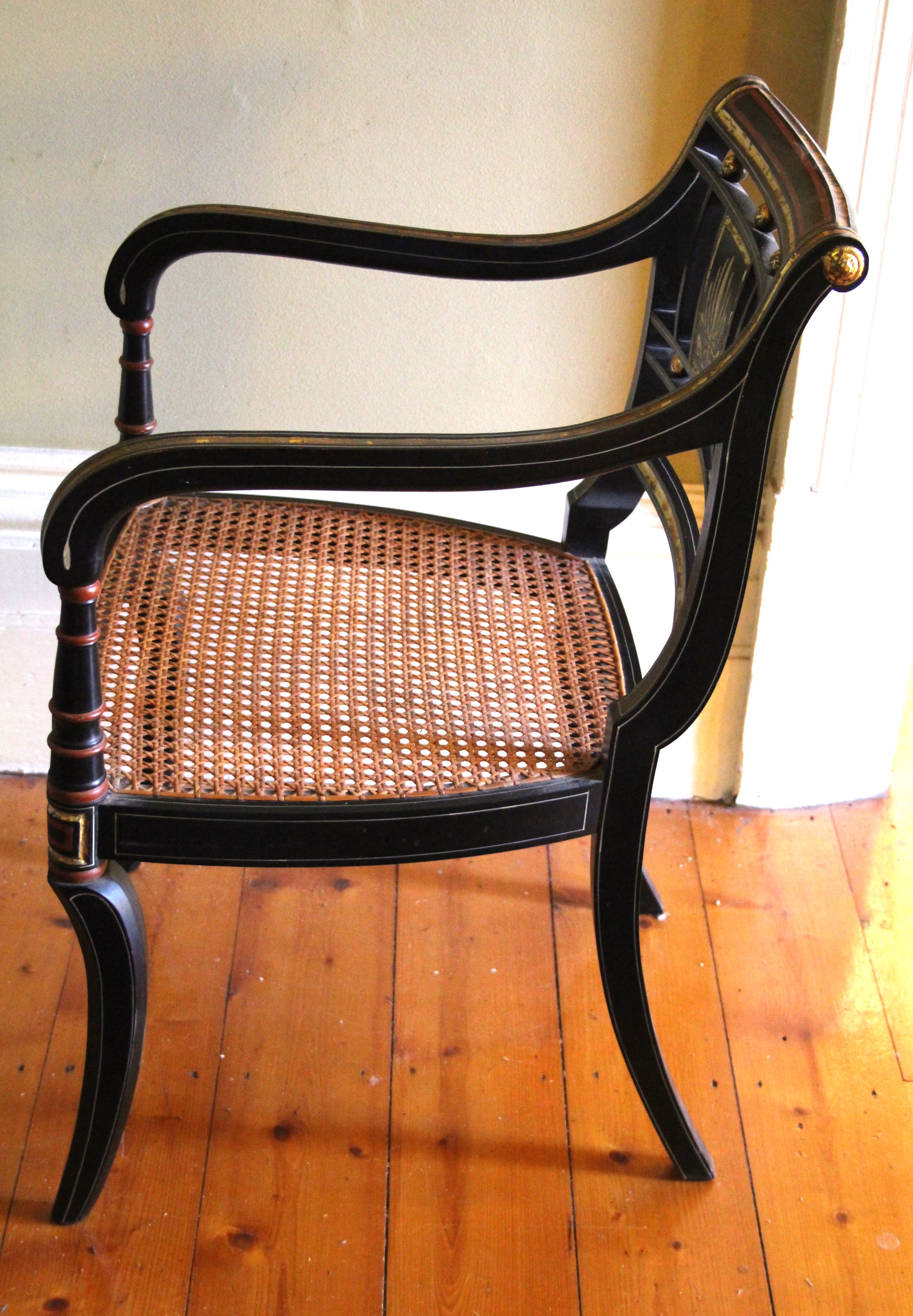 Regency ebonised armchair with gilded decoration with anthemeon decorated back splat, sabre shaped supports.  All original including the caning which comes with its own cushion which also appears to be original.