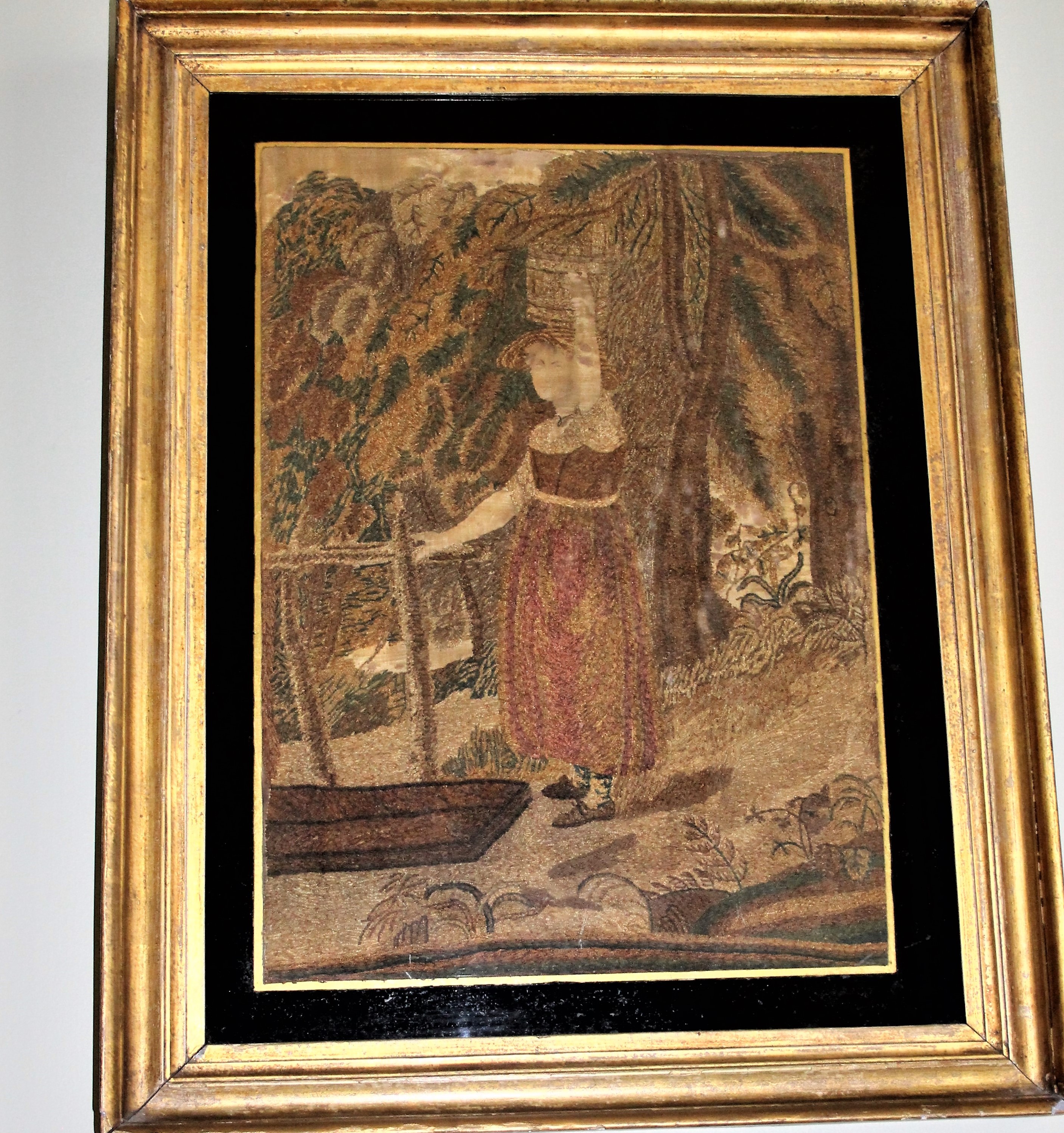 An English Needlework picture of a girl carrying a basket. Silk and Chenille thread, original frame and gilding with verre' eglomese' glass.
