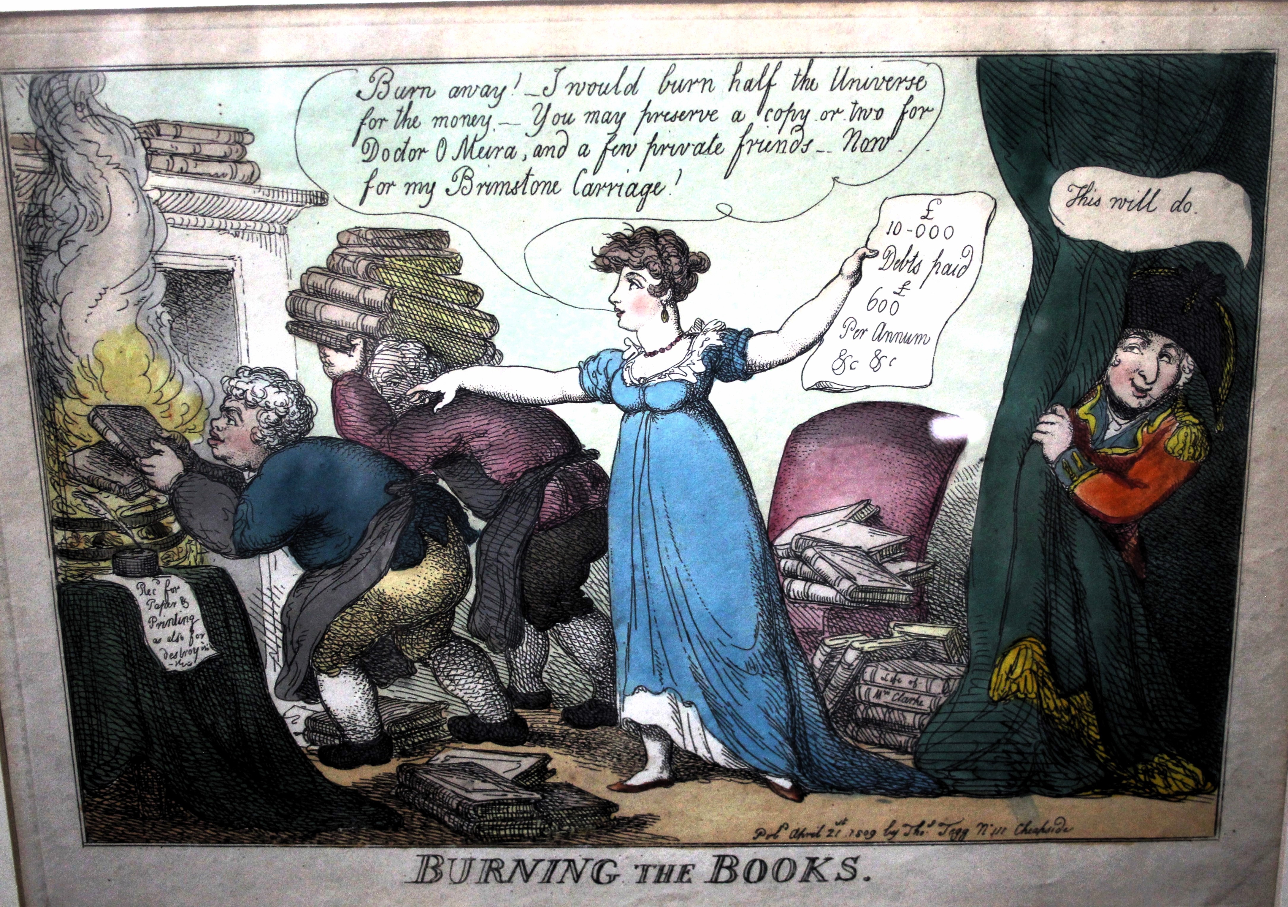 Thomas Rowlandson "Burning the Books" hand coloured engraving. Published by Thomas Tegg, 111 Cheapside 1809. Framed.