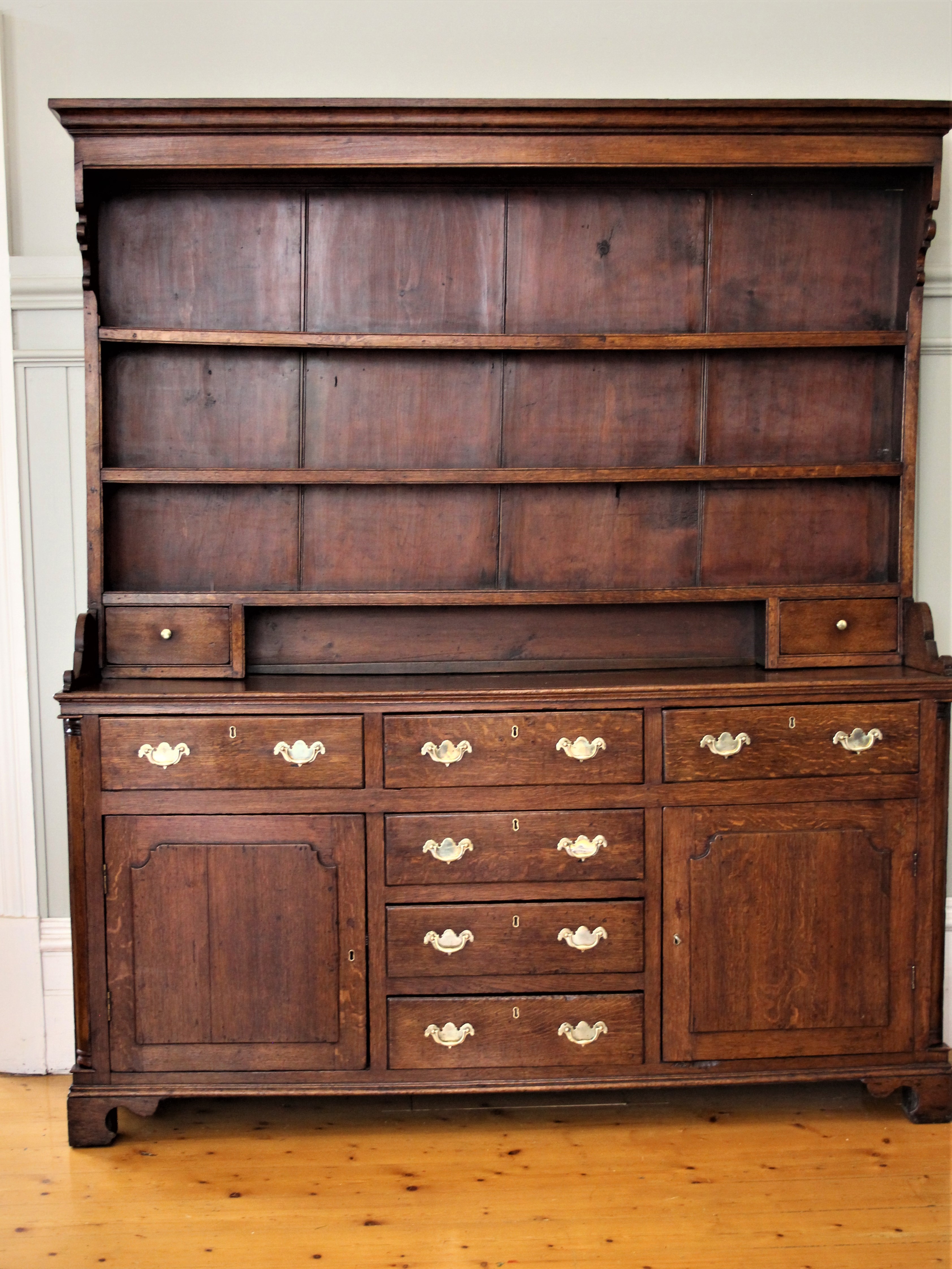 Antique oak Welsh (Caernarvonshire) the base with six drawers and two cupboards. The top with three plate shelves above two spice or salt drawers.Fine original piece of good colour. Last sold in Melbourne February 1962.