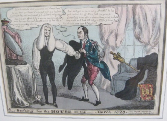 William Heath (Paul Pry) "Dressing for the House" hand coloured etching a satirical print. Framed.