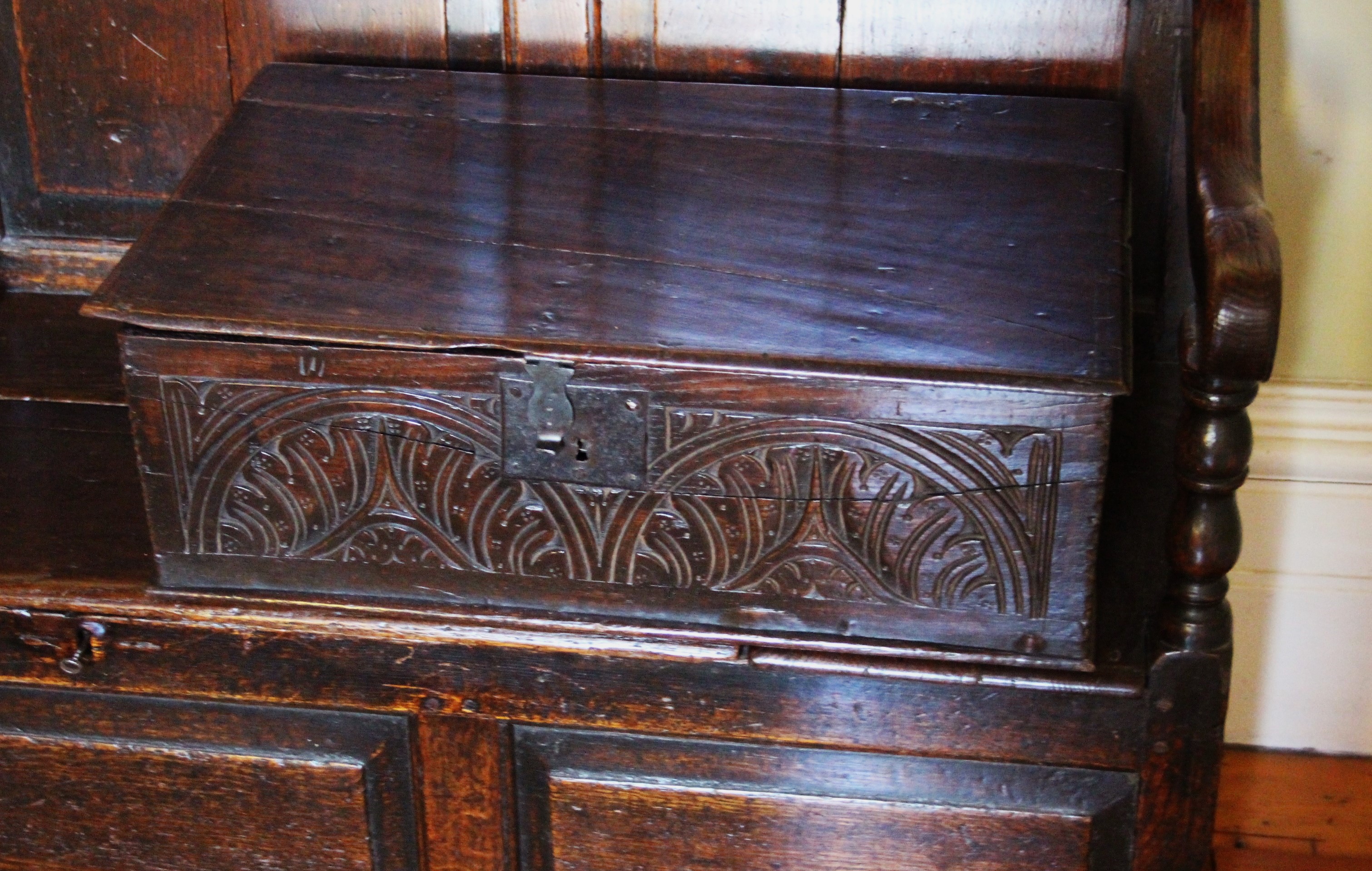 Charles II carved Oak Boarded Box, Somerset origin. Initials "WS"