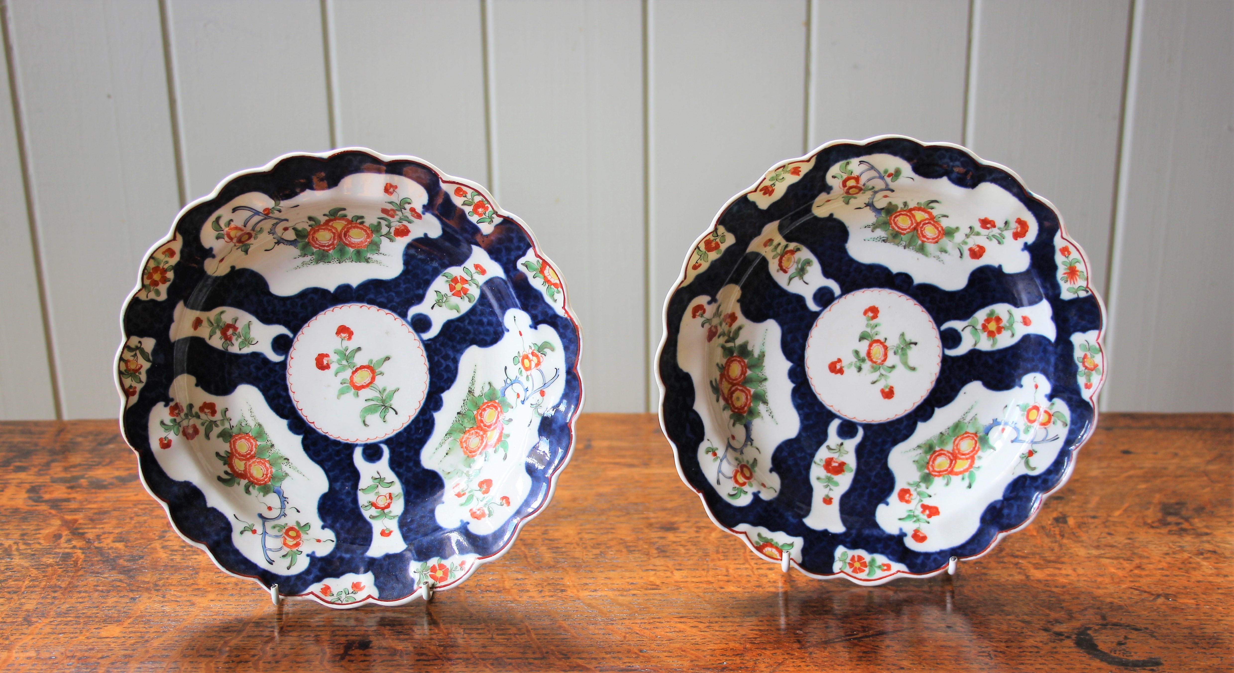 Pair of Worcester small dishes, Blue Scale ground with vase an mirror shaped reserves within rococo borders.